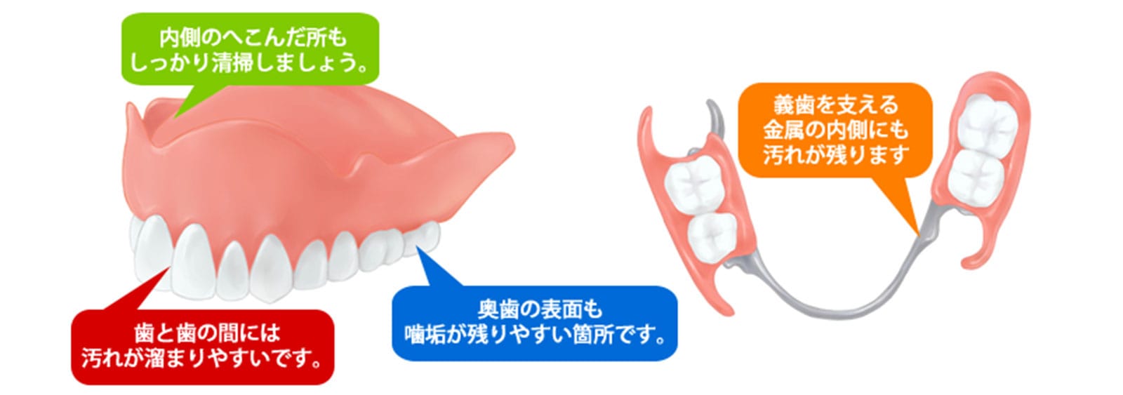 歯にプラークが付着して、しばらくすると歯石ができるように、入れ歯にもプラークや歯石が付着します。 入れ歯を掃除しないとそこに食べかすがたまり、細菌が繁殖しやすくなります。
